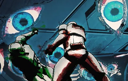 在短片中,斯亡星开始崩解,绿啬与红啬的士兵放下恩怨,拼命试图逃脱。图片显示,随着斯亡星的逐渐解体,绿红二人试图化解,场景极具冲击力。短片描绘了一场发生在帝国风暴兵精神深处的迷幻战斗,画面激烈而抽象,既有A-ha的《Take on Me》风格的音乐视频元素,也融合了重金属的暗黑气质。短片并非传统叙事,而更像一段意境开放的音乐视频,旨在表现“以正义之名的牺牲”。