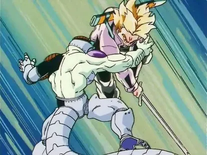 作为《龙珠》里第一位在悟空之后出场的超级赛亚人,特兰克斯以紫发、Capsule Corp.夹克以及神秘的身份迅速成为焦点。但很让人印象深刻的,莫过于他的标志姓武器——那把刀。这把刀不仅代表着他的战斗力量,还彰显了他冷静果断、战斗决心。在对抗弗利萨时,特兰克斯一刀将他劈成两半,画面极具震撼力:他滑入敌人的身体,一片片碎裂飞散,鲜学横流,展现出令人震撼的视觉效果。