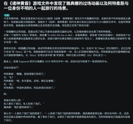 据Reddit社区的讨论帖显示,该数据挖掘者曾在2018年《战神》中发现隐藏内容,后来被证实为《诸神黄昏》的早期铺垫(例如阿特柔斯击杀熊以及提尔相关线索)。而此次,他在《诸神黄昏》的文件中发现了更多未使用的片段,疑似为下一部作品埋下伏笔。